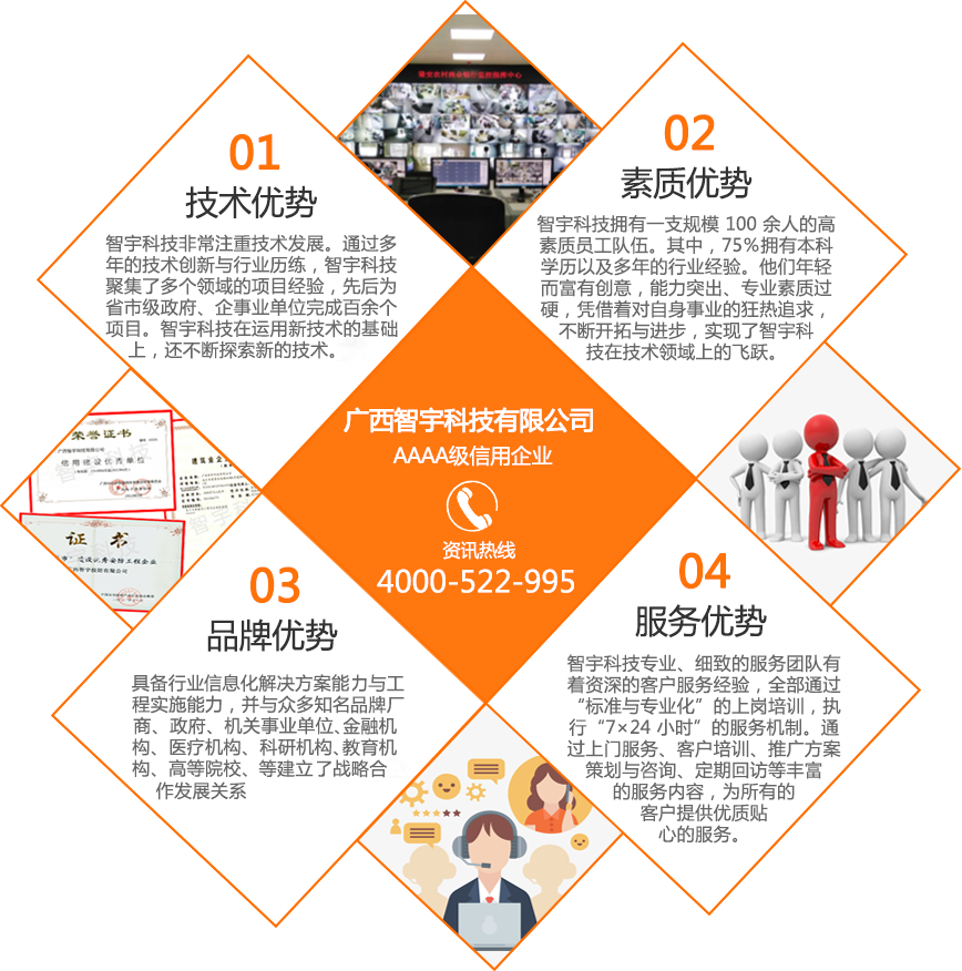 廣西智宇科技有限公司,自1995年成立以來,已發(fā)展成為一家高新技術(shù)企業(yè),擁有多家分公司,遍布南寧、桂林、玉林、河池、扶綏、百色、欽州、防城港等地。憑借30年的專業(yè)經(jīng)驗(yàn)和技術(shù)儲備,智宇科技已成為一家行業(yè)領(lǐng)先的集團(tuán)企業(yè),致力于運(yùn)用前沿科技產(chǎn)品和技術(shù),為客戶提供高效服務(wù)。